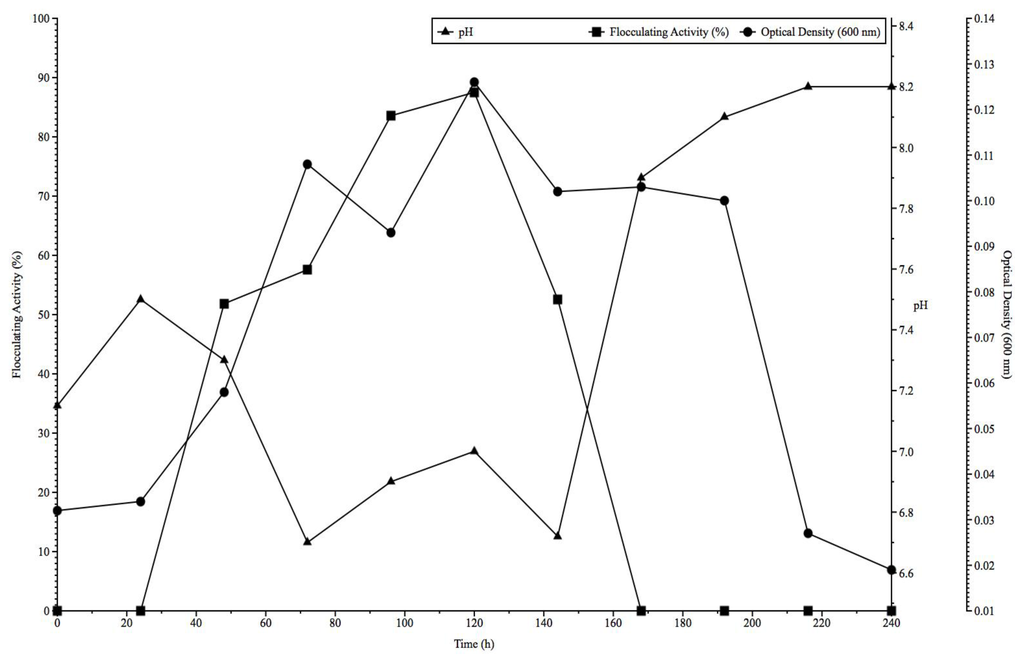 Time course assay of flocculant production by Arthrobacter sp. Raats.