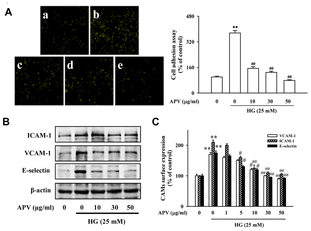 One of the earliest events in atherogenesis is the adhesion of monocytes to the endothelium, followed by their infiltration and differentiation into macrophages [2]. These cell adhesion molecules primarily mediate the adhesion of monocytes specifically found in atherosclerosis lesions to the vascular endothelium. To explore the effect of APV on endothelial cell-leukocyte interaction, we examined the adhesion of HL-60 cells to HG-activated HUVEC under static conditions. Figure 1A showed that control HUVEC showed minimal binding to HL-60 cells, but adhesion was markedly increased when they were treated with HG. Pretreatment with 10–50 μg/mL APV significantly decreased the number of HL-60 cells adhering to HG-induced HUVEC (P < 0.01). In the experiment to determine whether APV inhibits HG-induced increase of ICAM-1, VCAM-1, and E-selectin expression, various APV concentrations ranging from 10 to 50 μg/mL were added to HUVEC. As shown in Figure 1B, pretreatment with APV decreased HG-induced ICAM-1, VCAM-1, and E-selectin expression with the inhibitory effect being observed over 5 μg/mL. The results using cell based-ELISA demonstrated that HG also increased ICAM-1, VCAM-1, and E-selectin levels. However, pretreatment with APV significantly decreased HG-induced ICAM-1, VCAM-1, and E-selectin levels (Figure 1C). In this study, APV (1–50 μg/mL) did not alter any cytotoxicity (data not shown).