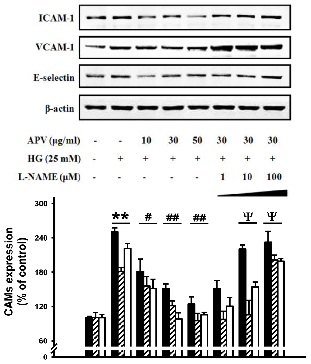 Effect of an APV on HG-induced cell adhesion molecules expression in the presence or absence of L-NAME. HUVECs were preincubated with L-NAME (1~100 μM) for 30 min prior to the treatment of APV, followed by HG for 24 h. The lower panel depicts quantitative data, expressed as ICAM-1 (■), VCAM-1 (▨), and E-selectin (□) normalized to β-actin, and the results are expressed as the % of the control. Each electrophoretogram is representative of the results from five individual experiments. ** P < 0.01 vs. control, # P < 0.05, ## P < 0.01 vs. HG alone, ψ P < 0.05 vs. APV + HG.