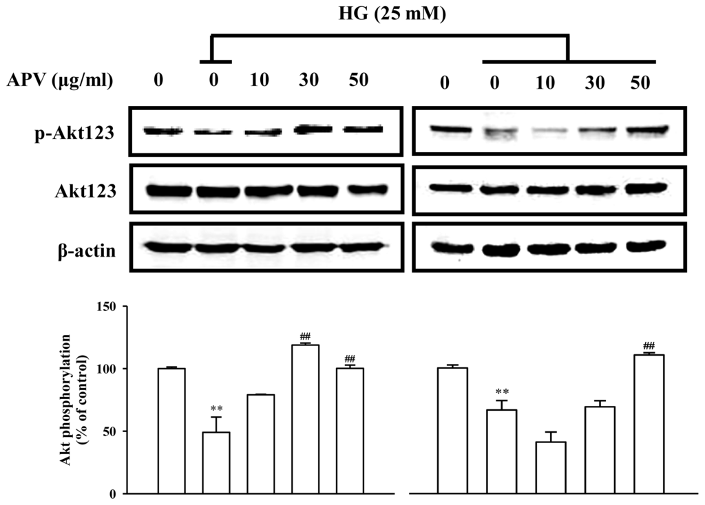 Effect of APV on Akt phosphorylation. HUVEC were treated with APV or HG alone for 1 h (left), and pretreated with APV for 30 min and then stimulated with HG for 1 h (right). Each electrophoretogram is representative of the results from five individual experiments. ** P < 0.01, vs. control; ## P < 0.01, vs. HG alone.