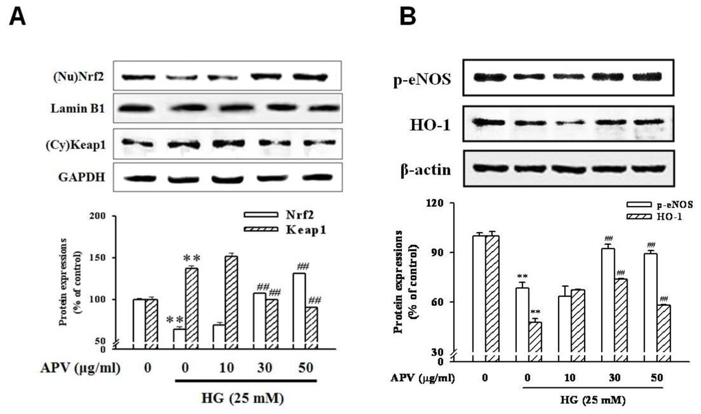 Effect of APV on Nrf2, eNOS, and HO-1 activation. (A) HUVEC were pretreated with APV for 30 min and then stimulated with HG for 1 h. The nuclear and total cellular protein extracts were blotted with Nrf2, lamin B1, Keap1, GAPDH, respectively. Nuclear Nrf2 levels were normalized to lamin B1 levels; (B) The total protein (40 μg) extracts were blotted with the antibodies specific for eNOS Ser-1177, HO-1, and β-actin. Each electrophoretogram is representative of the results from five individual experiments. ** P < 0.01, vs. control; ## P < 0.01, vs. HG alone.
