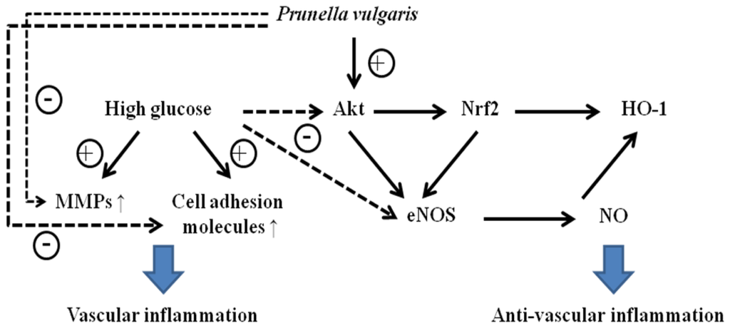 Vascular inflammation induced by HG occurs early in the development of atherosclerosis, and determines future diabetic complications. The present study suggested that APV significantly suppressed the following events in cultured vascular endothelial cells: HG-induced intracellular ROS formation and redox-sensitive NF-κB activation via suppression of IκB degradation and phosphorylation; cell adhesion molecules expression; adhesion to monocytes; and MMP-2/-9 proteolytic activities. Simultaneously, APV activates vascular protective signal pathways against HG-induced vascular inflammation in the following manner: Firstly, APV-induced PI3K/Akt-mediated Nrf2 activation, via the suppression Keap1 degradation, could induce activation of HO-1 and eNOS (Figure 6). Thus, APV inhibits in vitro vascular inflammation and may prevent diabetic atherosclerosis via inhibition of ROS/NF-κB pathway by inducing Nrf2-mediated HO-1 and eNOS activation. This data casts a new light on the actions of Prunella vulgaris and its potential benefits to diabetic patients for preventing diabetic vascular complications.