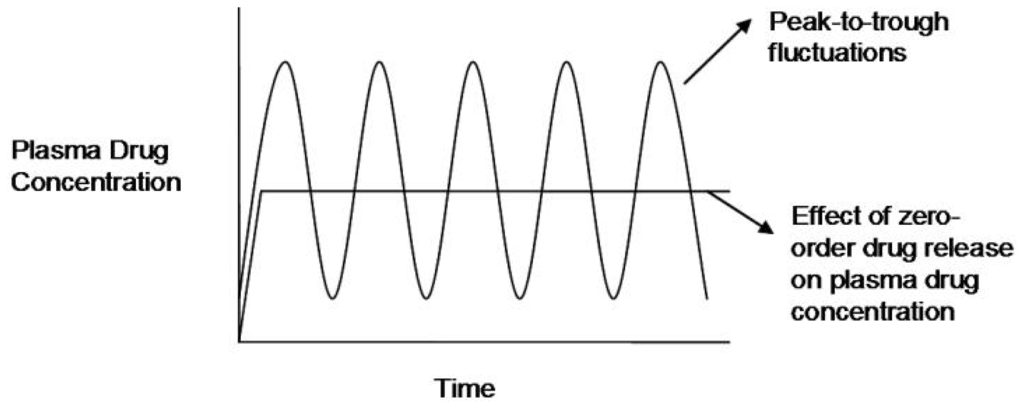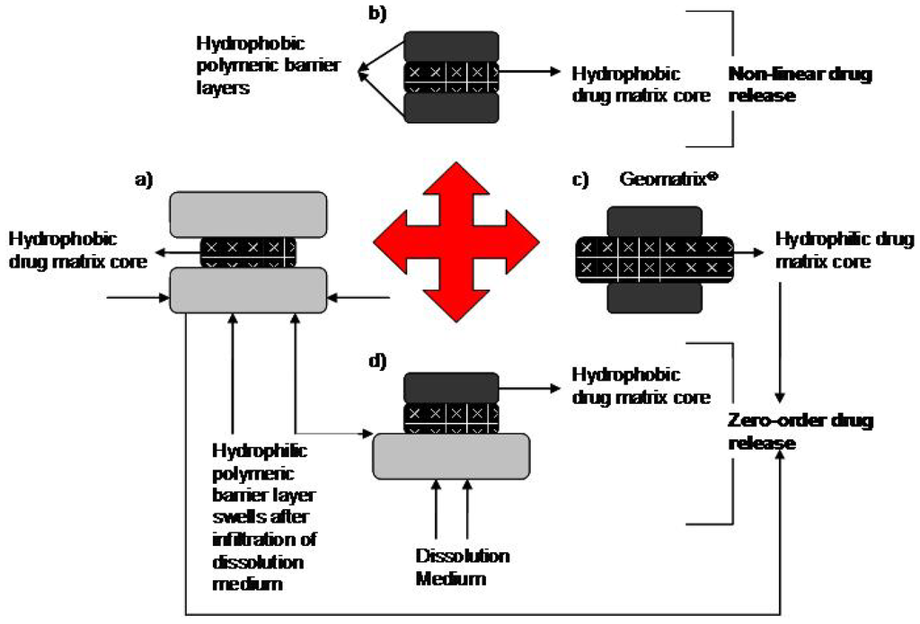 | Geomatrix® | Triple/bilayered tablet. | Type of polymer used, thickness of layers. | Zero-order kinetics |