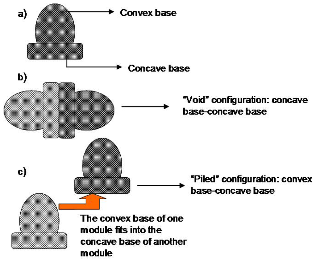 | Dome Matrix®/“Release modules assemblage” | Elementary module containing a concave base side and a convex base side. Various arrangements of modules to form different structures | Arrangement of modules, type of polymeric material used. | Various according to arrangement of modules e.g., Concave base attached to concave base. |