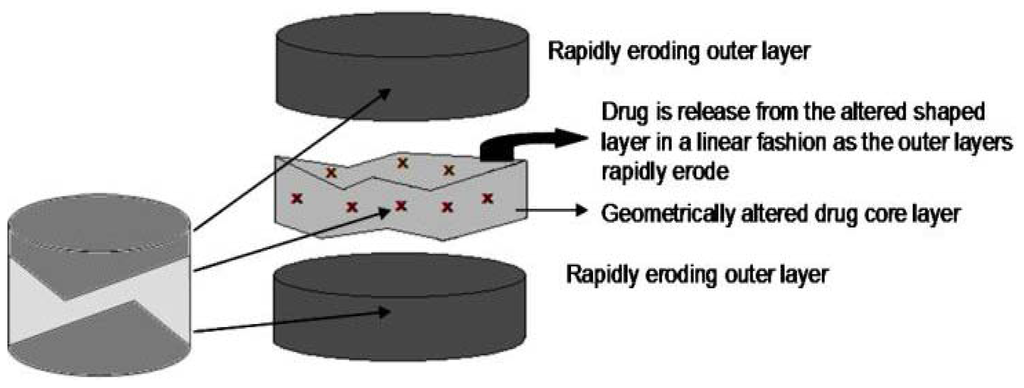 | Smartrix® | Triple-layered tablet with core layer having a specific shape different to that of the outer layers. | Shape of core layer. | According to shape of core, zero-order kinetics |