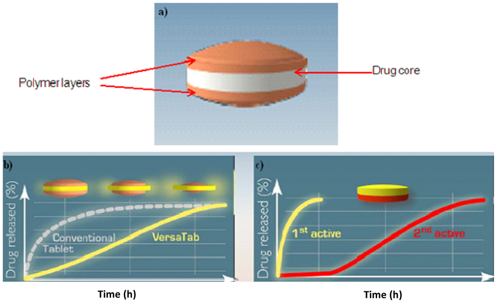 | VersaTab® | Bilayered tablet | Core drug, polymer layers | Immediate release and controlled release |