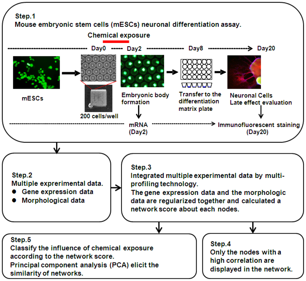 Here, we produced a high-content and sensitive method for quantitatively measuring the developmental neuronal toxicity of 12 environmental chemicals (see Table 1) using mESCs test combined with DNA microarray analysis, morphological analysis and Bayesian approaches. This confers a new predictive insight for chemical screening in a complex cell culture system that mimics early mammalian embryonic development. We performed multi-parametric profiling of gene expression data sampled at the early stage of mESC differentiation and neuronal phenotype data sampled at a later stage of neuronal cell differentiation after embryoid body (EB) formation. Then, these sampled data were analyzed by a Bayesian network analysis (BNA). This analysis can be depicted graphically to represent the probability structure of the causal complex [12–14].