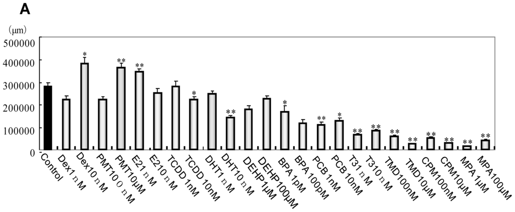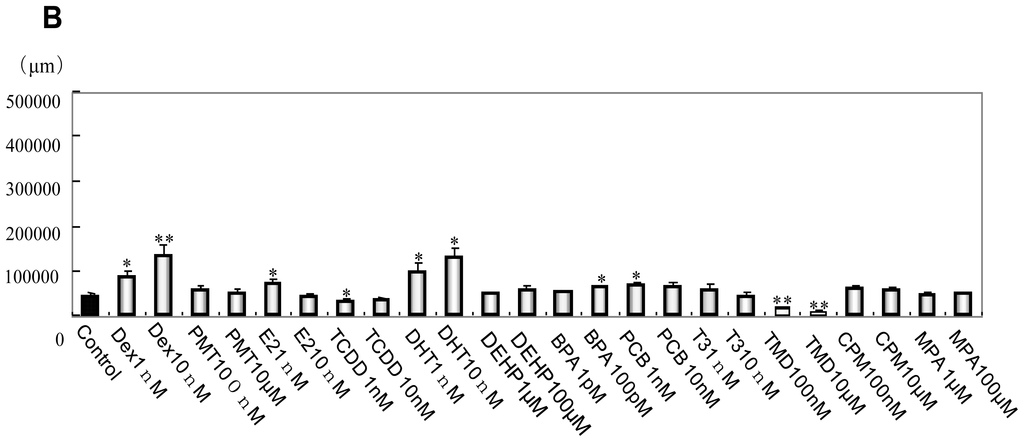The microsphere array used in this study is a frame separated type (chip 300, STEM Biomethod Corporation, Kitakyushu, Japan), which is made of acrylic resin and the surface has been coated with PDMS resin that is not structured for direct cell adhesion. 1024 wells (diameter 300 μm) were arranged on the surface of the microsphere array. EB formation was performed in the three dimension culture based on the microsphere array. After removal of mouse fibroblast cells, aggregated ES cells were counted and 250 μL cell suspension solution (2 × 105 cells) were put on the microsphere array. Six hours later, the medium was exchanged for each chemical containing medium and incubation continued for 48 h. After that, RNA was isolated for gene expression analysis and culture medium was exchanged for EB medium with add 10 nM retinoic acid for the further morphological analysis. EBs were cultured for 6 days with EB medium replaced every two days. Eight days after chemical exposure, aggregated EBs were replated on Ornithine/Laminine coated 24 wells plate (83 EBs/well). Twenty-four hours later, EB medium was exchanged for neural differentiation medium (DMEM/F12 (1:1), N2 (×100), and 10 ng/mL bFGF) and EBs were cultured for another 20 days, exchanging the medium every 3 days. DMSO was used as the primary solvent for all chemicals, and the DMSO solutions were further diluted in cell culture media for treatments. The final concentrations of DMSO in the media did not exceed 0.1% (vol/vol). The concentrations of chemicals used in this study were: 1 pM and 100 pM for BPA; 1 nM and 10 nM for T3, DEX, E2, DHT, PCB and TCDD; 0.1 μM and 10 μM for CPM, PMT and TMD; 1 μM and 100 μM for MPA and DEHP. The neuronal differentiation parallel to development in vivo was confirmed by quantitative RT-PCR of stage specific markers, Oct3, Nanog, Pax6 and Map2 (data not shown).