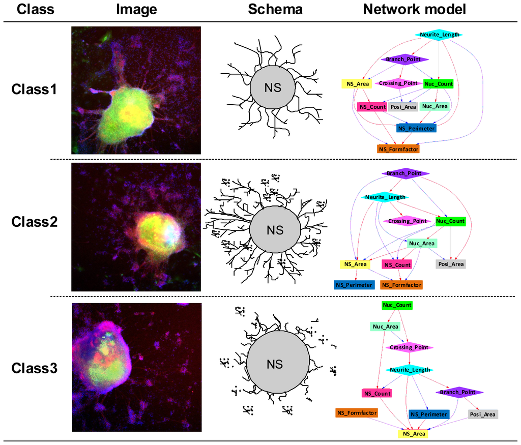 Classification based on morphological imaging and phenotypic feature networks. Class 1: Extension from the turning point is short while the neurite is long; Class 2: Neurite is long and the branch point is complex; Class 3: Neurite is short and there are many nucleus count.