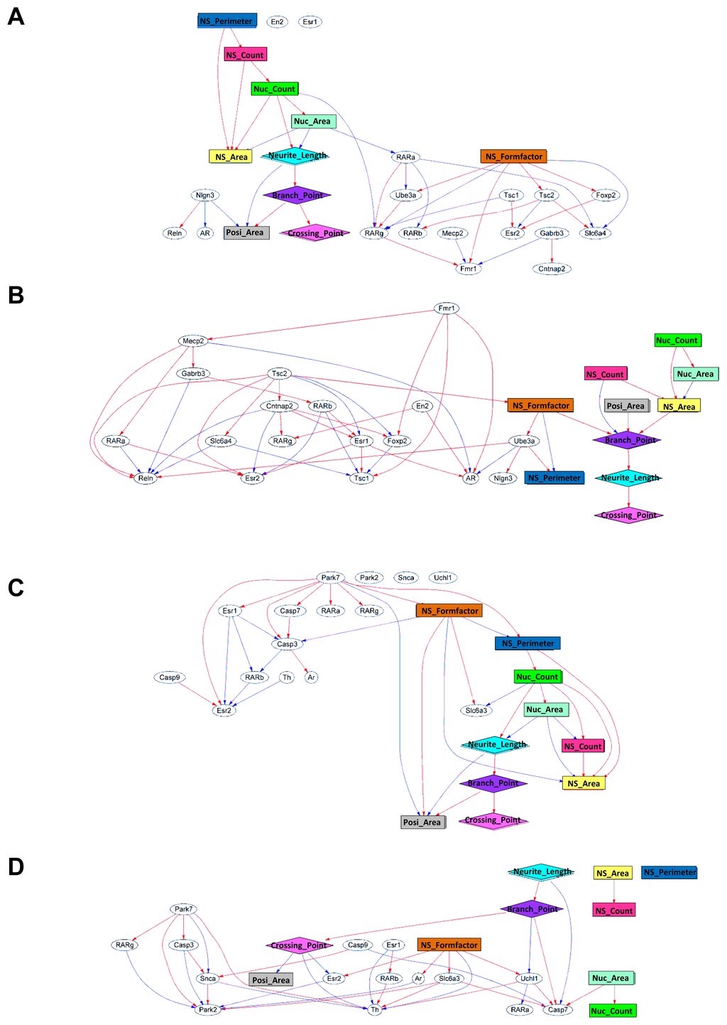 Typical example of GPINs for autism and Parkinson’s disease gene sets. Gene expression and morphological parameters were connected by the strength of the correlation. GPINs of autism related genes and morphological parameters: (A) the vehicle control (DMSO) and (B) TMD exposure. GPINs of Parkinson’s disease related genes and morphological parameters; (C) the vehicle control (DMSO) and (D) PMT exposure.