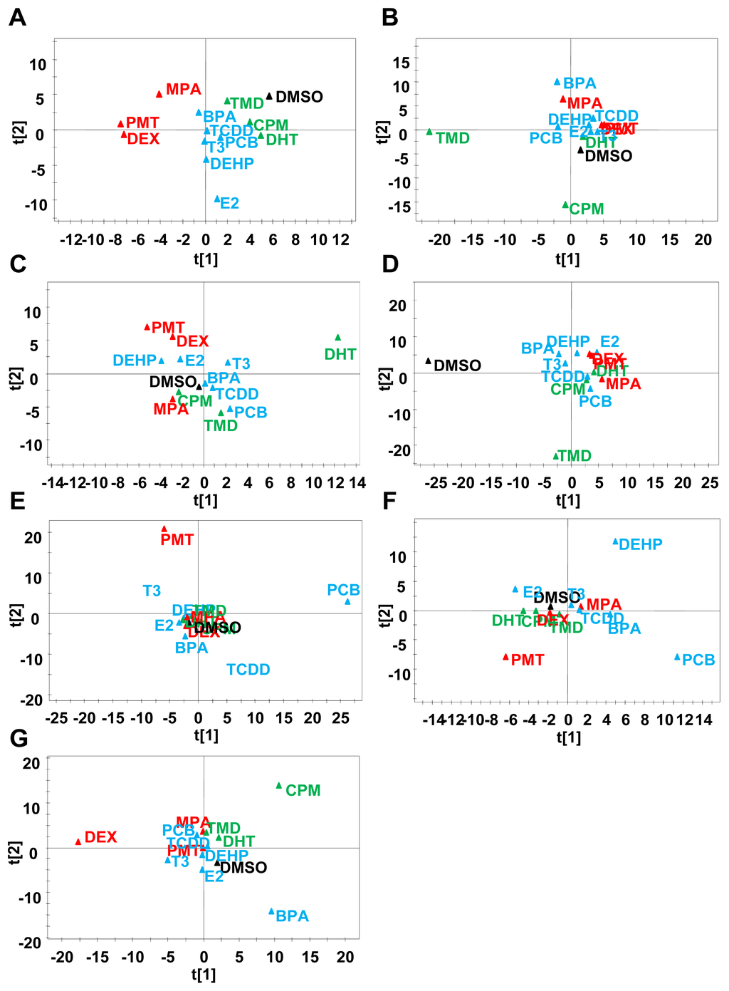 PCA based on Bayesian network parameters. PCA were applied to the Bayesian network parameters based on phenotypic and global gene expression profiling to evaluate the neurotoxicity of 12 environmental chemicals. Score plots based on (A) Alzheimer’s disease related gene set; (B) Autism related gene set; (C) Parkinson’s disease related gene set; (D) Axon guidance related gene set; (E) Pluripotent related gene set; (F) Neural development related gene set; and (G) Oxidative stress related gene set.