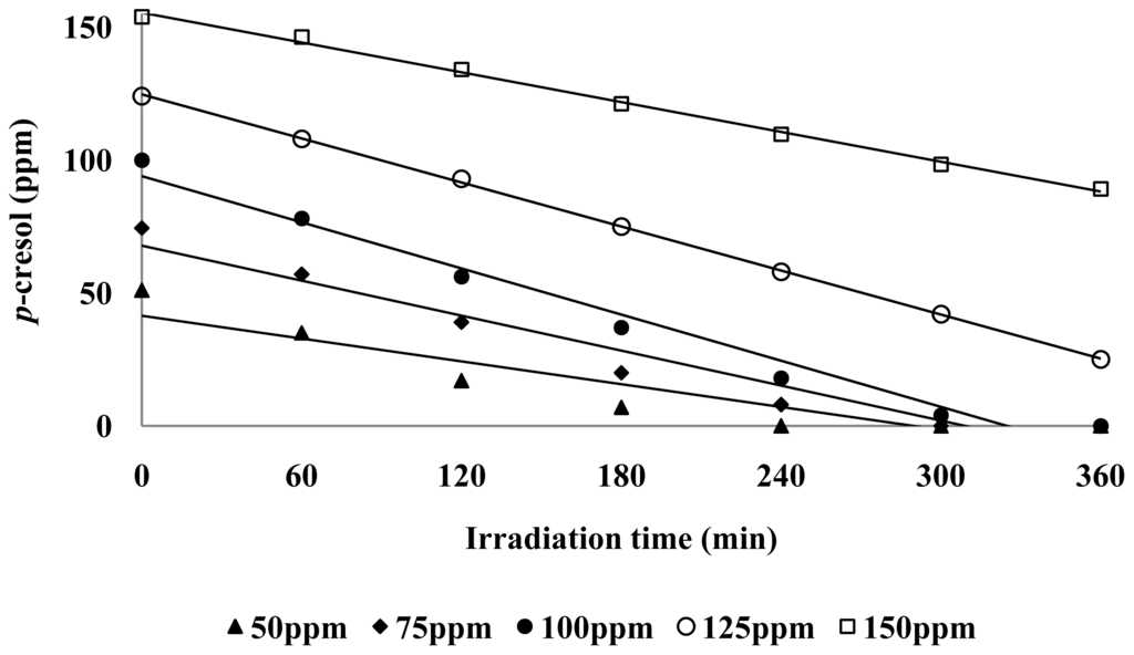 - Abdollahi, Y.; Abdullah, A.H.; Zainal, Z.; Yusof, N.A. Photodegradation of o-cresol by ZnO under UV irradiation. J. Am. Sci 2011, 7, 165–170. [Google Scholar]