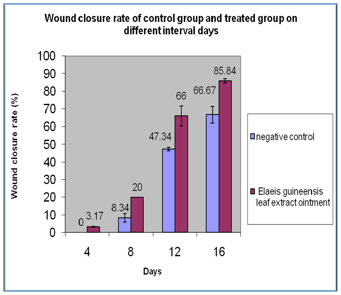In conclusion, Ointment from the leaf of E. guineensis exhibited significant pro-healing activity in the infected wound when topically applied on rats by affecting various stages of healing process. Apart from this, other properties such as antioxidant, antibacterial and antifungal activities make it a potential natural product-based ointment. The result of the present study offers pharmacological evidence to support the folkloric use of E. guineensis leaf for the healing of wounds in several African countries.