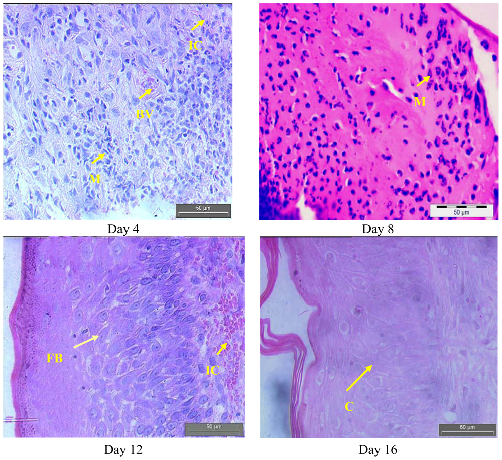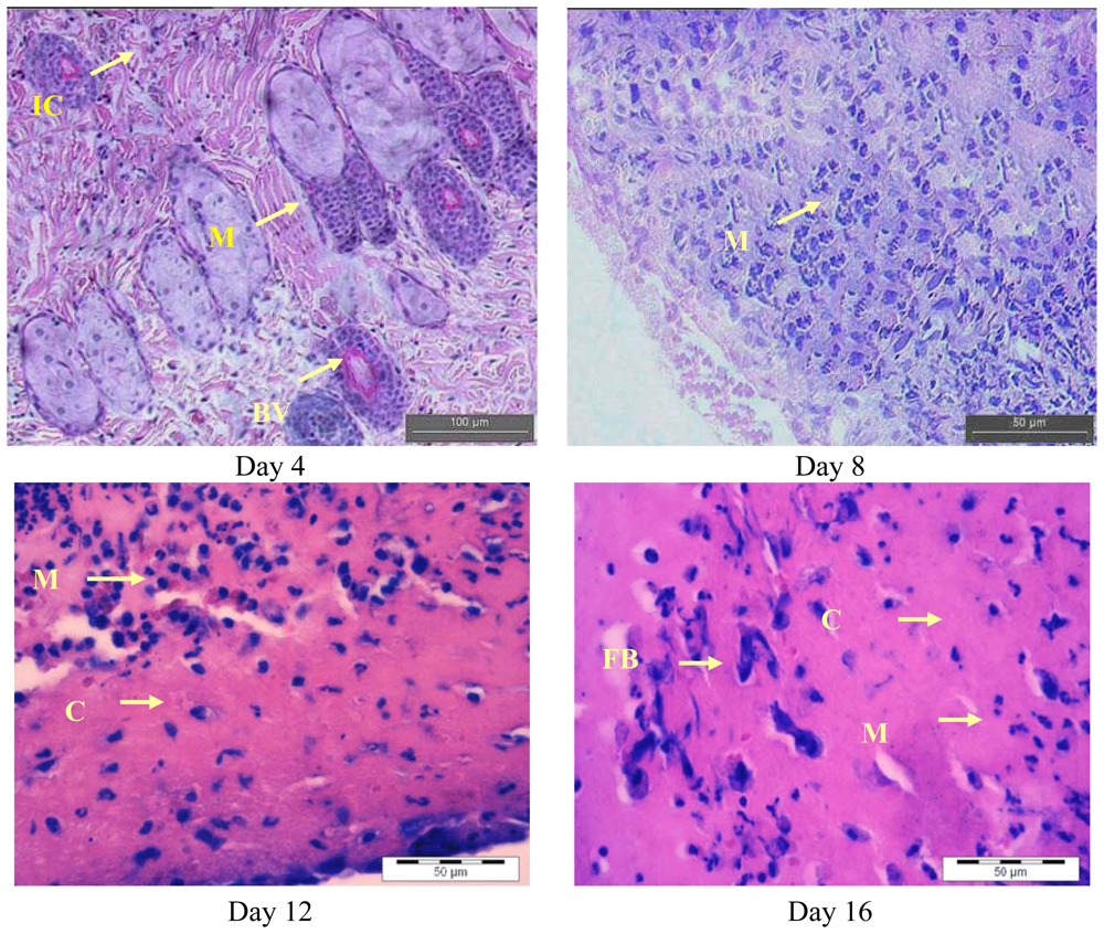 Hematoxylin and eosin stained sections of the granulation tissue in treated group at different time intervals. Fibroblasts (FB), macrophages (M), collagen (C) bundles, Vascularization with larger blood vessels (BV) and inflammatory cells (IC).