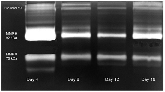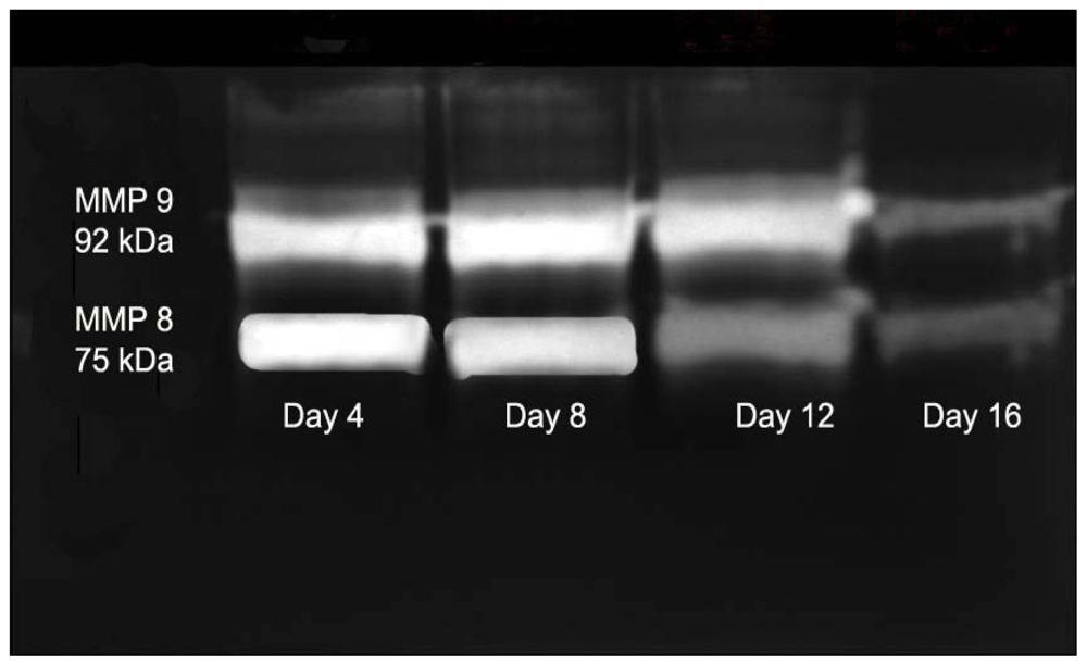 Gelatin zymography analysis shows the expression of pro and active forms of MMPs in the granulated tissue from the treated rats (Figure 5) at different days of healing (days 4, 8, 12 and 16). In the initial days of healing the expression of polymorphonuclear eutrophils derived MMPs (MMP 8–75 kDa, MMP 9–92 kDa) were high followed by a reduction in later days of healing. Expression of these MMPs was more in control rats (Figure 6) and persists until day 12.