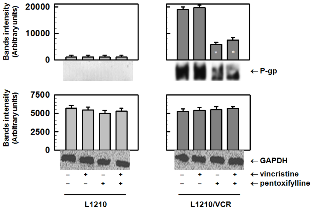 Reduction of P-glycoprotein (P-gp) protein levels by pentoxifylline (PTX). P-gp protein levels were analyzed L1210 and L1210/VCR cells treated with 1.2 μmol/L vincristine (VCR) and/or 100 μmol/L PTX for 24 h. The protein levels of P-glycoprotein and GAPDH (housekeeper) were determined by Western blot analysis using specific antibodies. Blots of three independent experiments were quantified and obtained data were evaluated by Student’s t test. Data represent means ± SD. * Different from control (without drugs) at significance level p < 0.01.