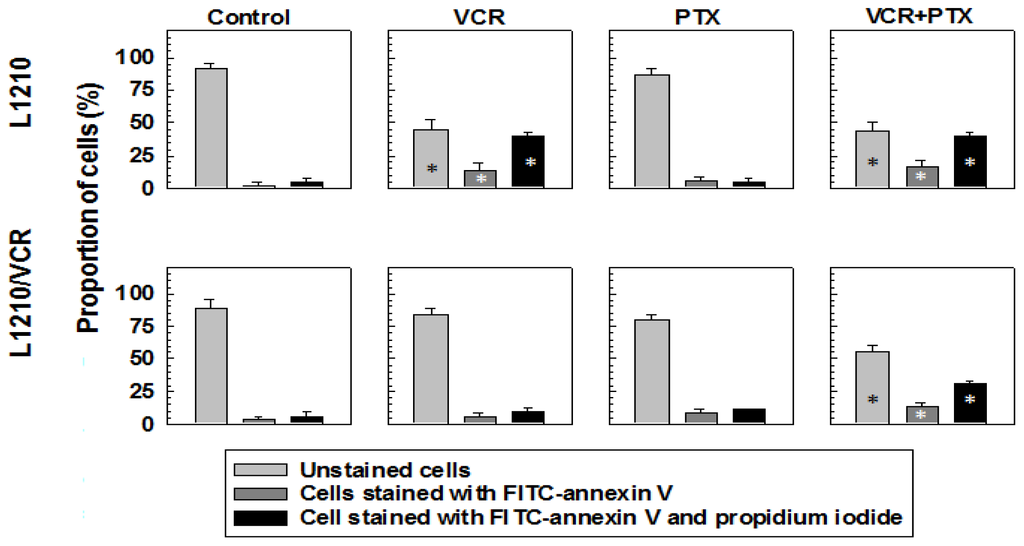 The effects of VCR and PTX on apoptosis induction in sensitive (L1210) and multidrug-resistant (L1210/VCR) cells. Cells were exposed to VCR (1.2 μmol/L) and/or PTX (100 μmol/L) for 24 h. Induction of apoptosis was detected by flow cytometry using an Annexin V-FITC Apoptos1is detection kit. Staining of cells by annexin V-FITC or propidium iodide was determined by measuring the fluorescence of cells using a Coulter Epics Altra flow cytometer. The proportions of cells stained with annexin V-FITC (early apoptotic cells), cells with both annexin V-FITC and propidium iodide (late apoptotic/necrotic cells) and unstained cells (normal cells) are summarized. Data represent means ± SD from free independent experiments. * Different from control (without drugs) at significance levels p < 0.01.