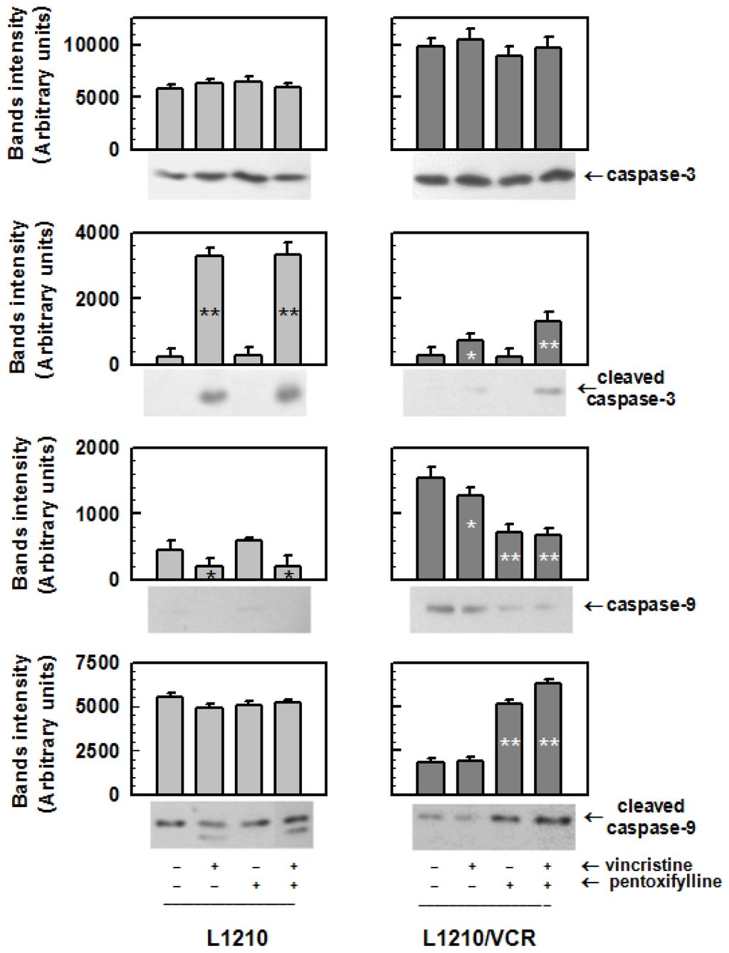 Effect of VCR and PTX treatment on caspase-3 and caspase-9. The sensitive L1210 and resistant L1210/VCR cells were treated with VCR (1.2 μmol/L) and/or PTX (100 μmol/L) for 24 h. The protein levels of full-length and cleaved caspase-3 and caspase-9 were determined by Western blot analysis using specific antibodies. Blots of three independent experiments were quantified and obtained data were evaluated by Student’s t test. * And ** different from control (without drugs) at significance level p < 0.01 and p < 0.05, respectively.