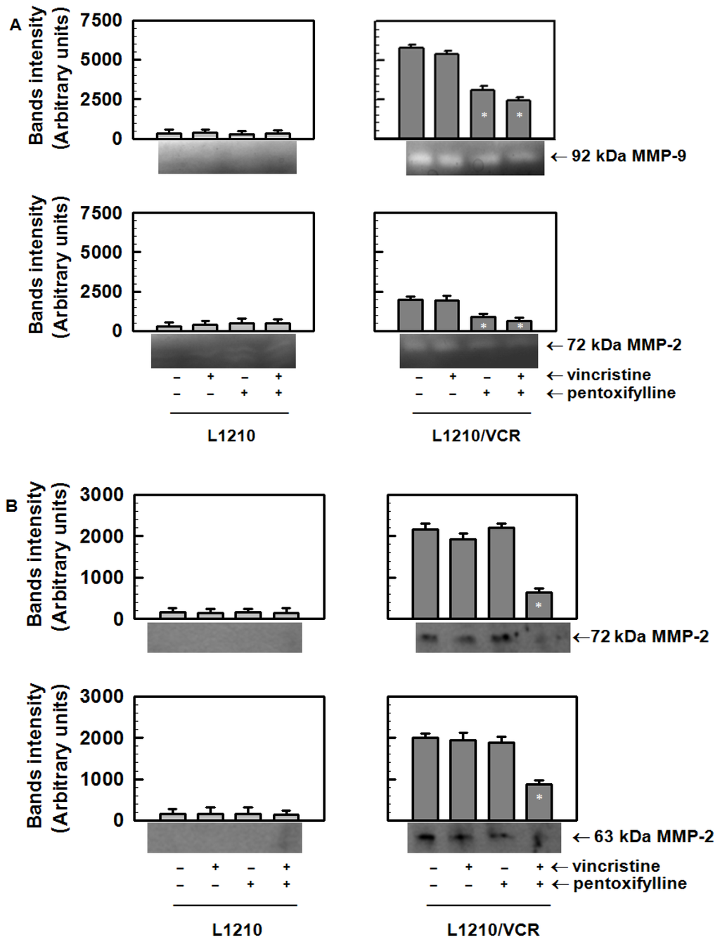 Effects of VCR and PTX treatment on the secretion of matrix metalloproteinases from sensitive L1210 and resistant L1210/VCR cells into the external medium. (A) Zymogram showing the activities of matrix metalloproteinases analyzed using gelatin zymography; (B) The protein expression of secreted MMP-2 was analyzed by Western blot analysis using a specific antibody that reacts with both the 72 and 63 kDa forms of MMP-2. Zymograms and blots of three independent experiments were quantified and obtained data were evaluated by Student’s t test. * Different from control (without drugs) at significance level p < 0.01.