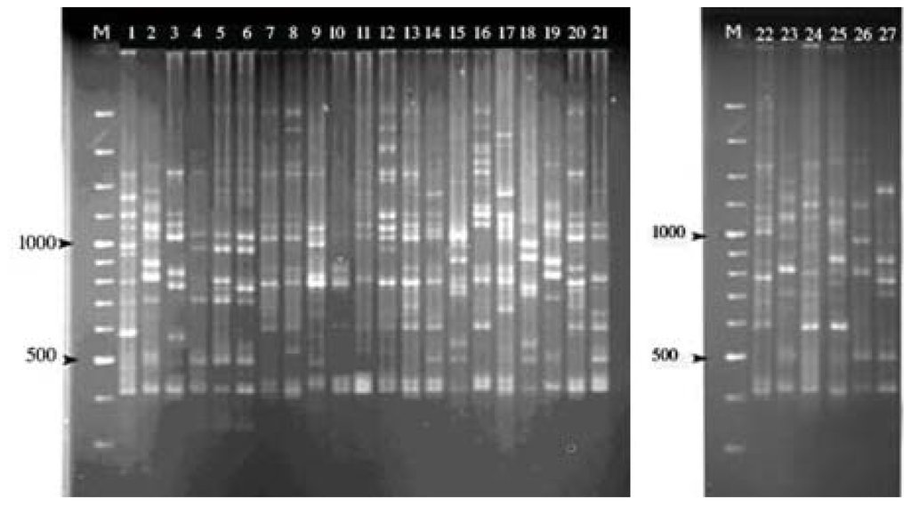 The fourteen selected ISSR primers produced 389 bands with an average of 27.78 bands per primer, of which 313 (80.5%) were polymorphic with an average of 22.36 bands per primer. The different ISSR primers amplified the number of bands from 20 (ISSR-14) to 40 (ISSR-11) having a range of 400 to 1200 bp fragments size. The number of polymorphic fragments detected by each primer ranged from 16 to 27. The most polymorphism was shown by ISSR-5, which showed 92.8% polymorphism. The mean of polymorphism information content (PIC) value for primers was 0.328 which ranged from 0.205 (ISSR-5) to 0.433 (ISSR-15) (Table 1). Figure 1 shows the banding pattern of genotypes generated by the primer ISSR-7.