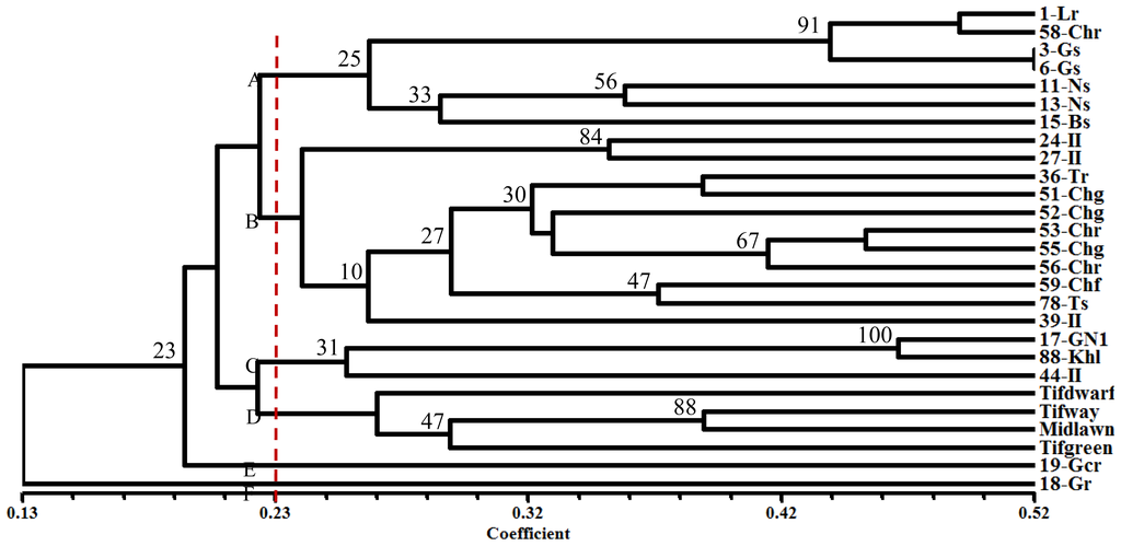 Four triploid hybrids (Cynodon dactylon × Cynodon transvaalensis), Tifgreen, Tifdwarf, Tifway and Midlawn were separated from all accessions and grouped together as cluster D.