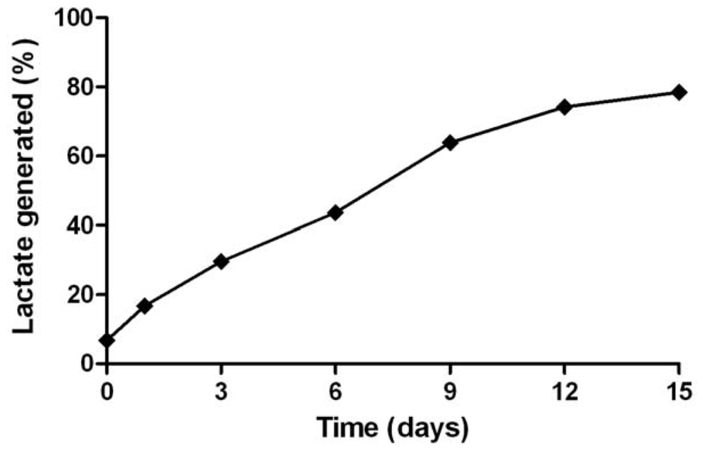 Lactate generation from mPEG-PLGA-PLL with incubation time in PBS (pH 7.4).