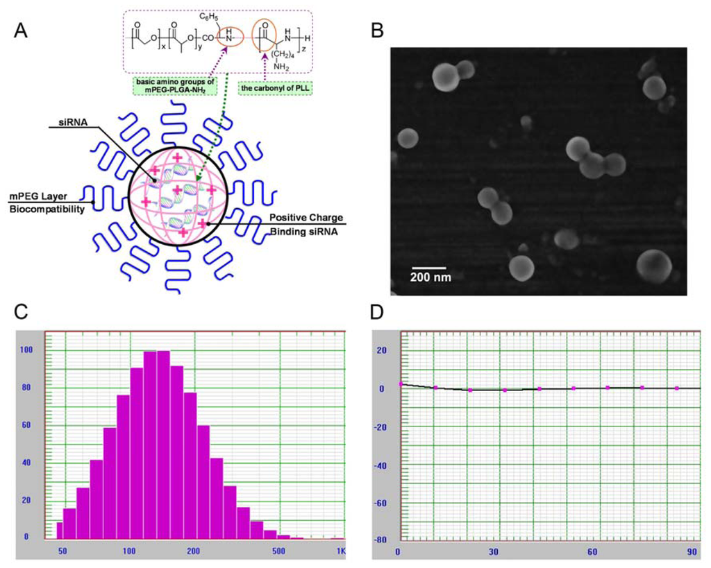 Characterization of NPs loading siRNA. (A) Schematic illustration of NPs loading Cy3-siRNA in PLGA-PLL core with mPEG arms; (B) SEM photograph of mPEG-PLGA-PLL NPs containing Cy3-siRNA; (C, D) Size distribution and zeta potential of NPs loading siRNA measured with a particle size and zeta potential analyzer.