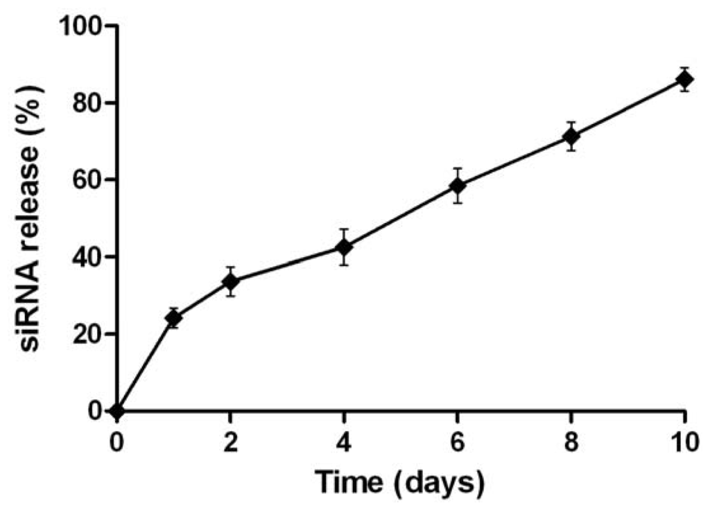 In the in vitro release experiment, NPs (20 mg) were suspended in 2.0 mL of 0.1 M phosphate buffer (pH 7.4), and stirred with a rotator at 37 °C. The NPs and supernatants were periodically collected by centrifugation at 14,000 rpm for 30 min. The amount of residual siRNA in NPs was determined using the same analytical method of encapsulation efficiency. The amount of released siRNA was also determined by HPLC. The released siRNA (%) from NPs was calculated as a ratio (%) of the released amount, to the total amount of detected siRNA (μg).