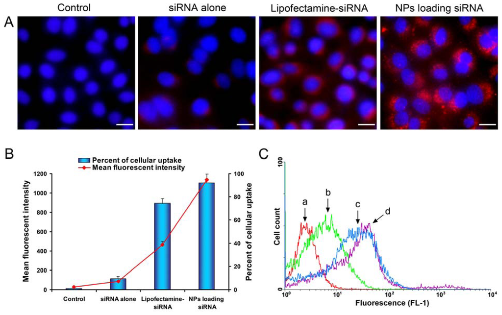 Intracellular uptake of siRNA. (A) Fluorescent images of cellular uptake of siRNA in the control and different treatment groups. Red, Cy3-labeled siRNA; blue, nuclei stained with Hoechst 33258. Scale bars represent 20 μm; (B) Quantitative analysis of cellular uptake of siRNA using FACSCalibur; (C) The flow cytometric picture of control cells (a, red) and SPC-A1-GFP cells treated with siRNA alone (b, green), Lipofectamine-siRNA (c, blue) or NPs loading siRNA (d, purple) were shown.