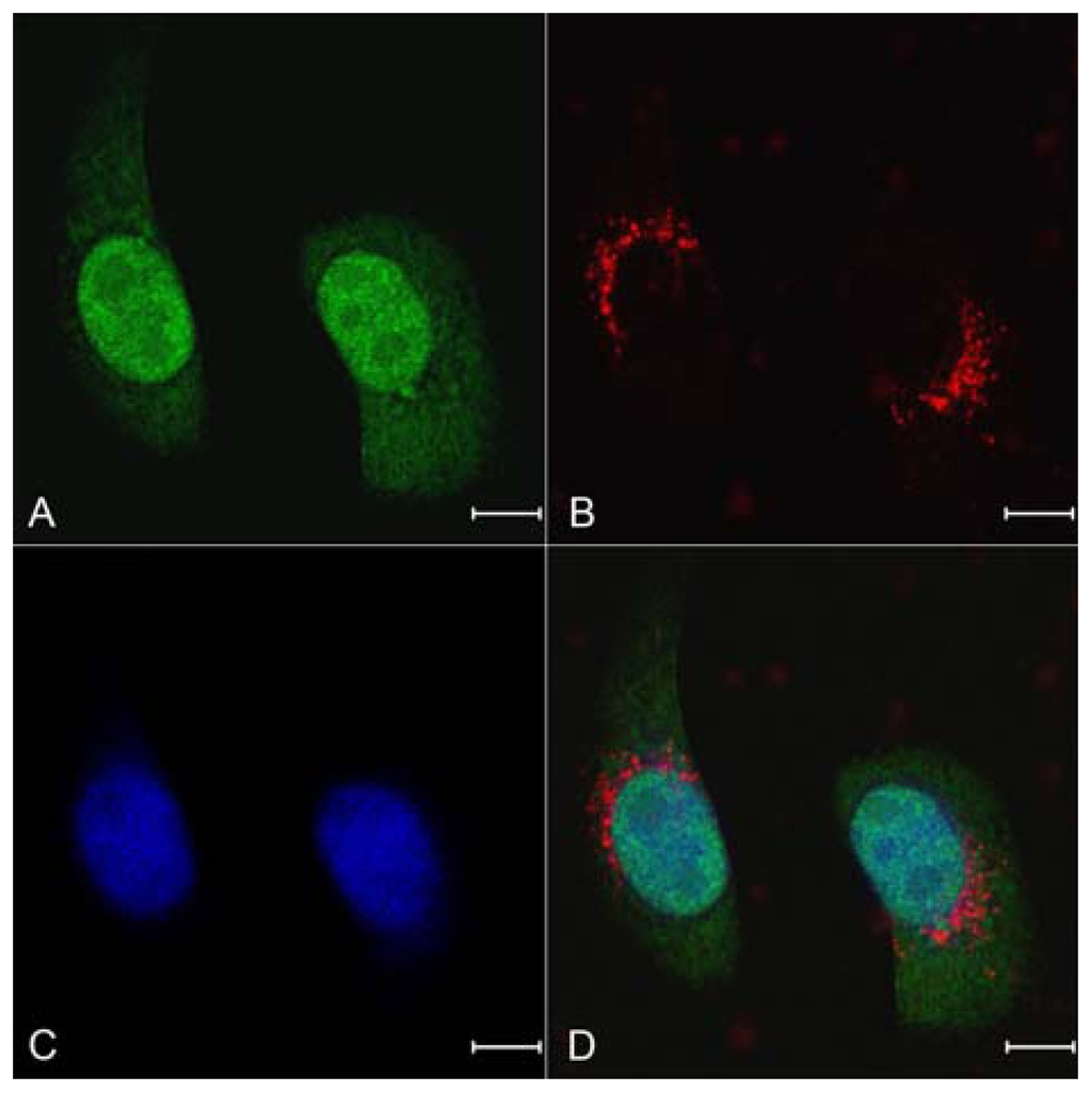 Localization of intracellular NPs loading Cy3-labeled siRNA. SPC-A1-GFP cells were treated with NPs loading Cy3-labeled siRNA and observed at 1000× magnification by a confocal microscope for (A) green fluorescence; (B) Cy3 red fluorescence; or (C) blue fluorescence of nuclei stained with Hoechst 33258; (D) A merged image of (A), (B) and (C) was shown. Scale bars represent 10 μm.