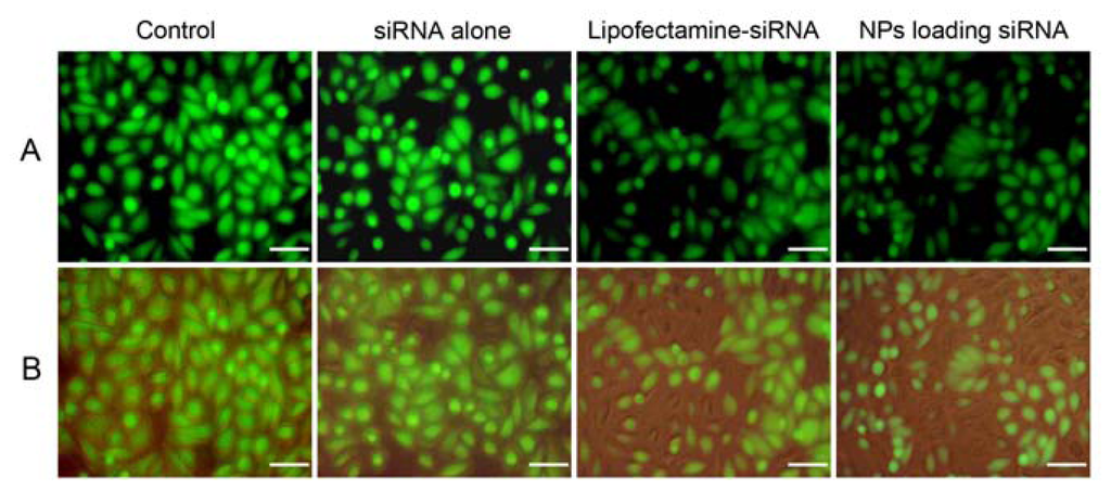 Fluorescent microphotos of SPC-A1-GFP cells treated with various siRNA formulations after 48 h of transfection. (A) The green fluorescent protein expression was observed under fluorescent microscope; (B) Merged images of the green fluorescent protein and cells seen under light microscope were shown. Scale bars represent 50 μm.