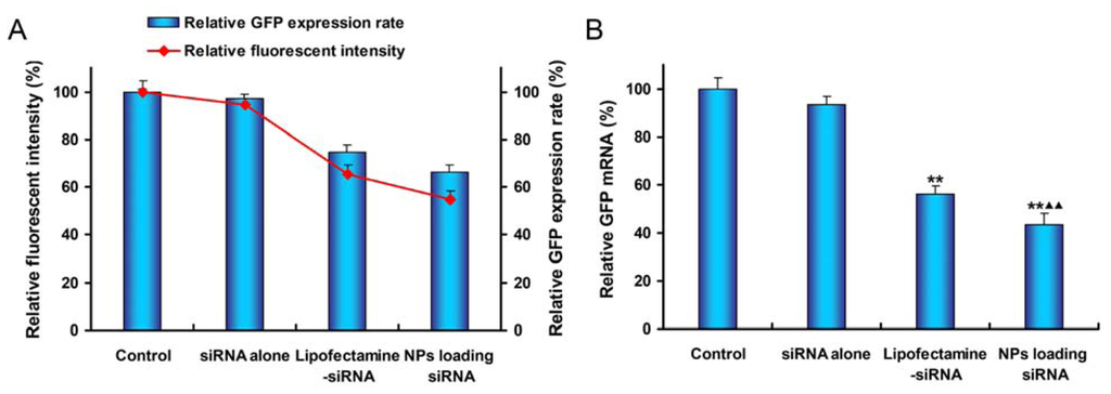 Comparison of gene silencing efficiency of various siRNA formulations after 48 h of transfection. (A) The level of GFP expression was estimated by the flow cytometric quantitation of green fluorescence; (B) RT-PCR analysis for relative GFP mRNA level was shown. (** P < 0.01 vs. control group, ▴ ▴ P < 0.01 vs. Lipofectamine-siRNA group).
