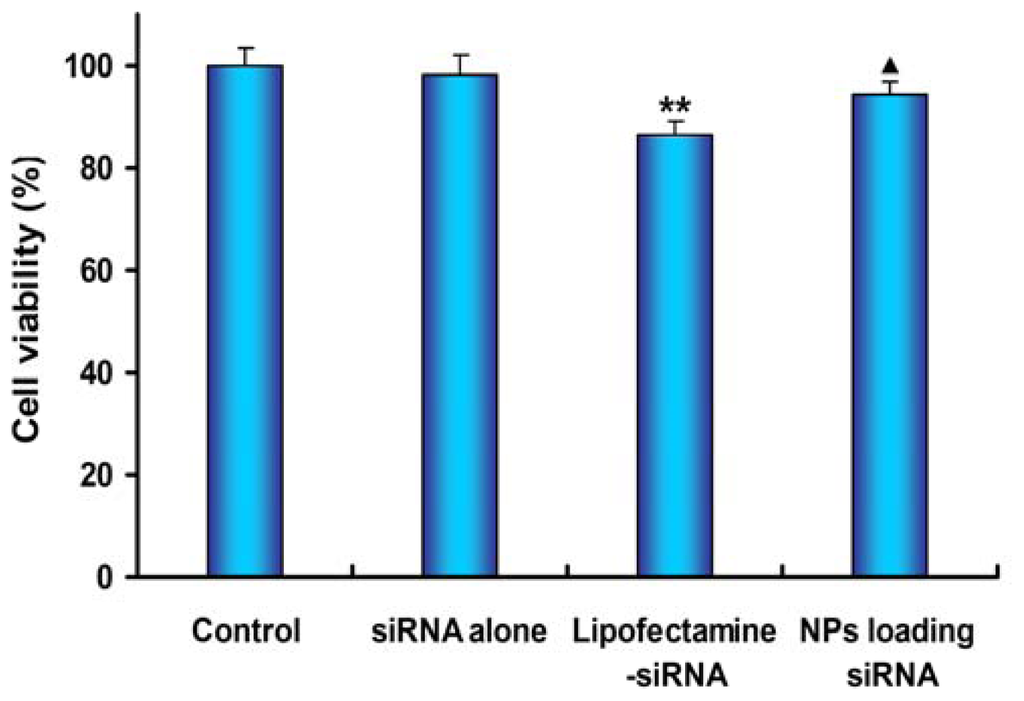 Cell viability assay. SPC-A1-GFP cells were treated with various siRNA formulations under the transfection conditions. The assays were done in triplicate and the standard error was shown. (** P < 0.01 vs. control group, ▴ P < 0.05 vs. Lipofectamine-siRNA group).