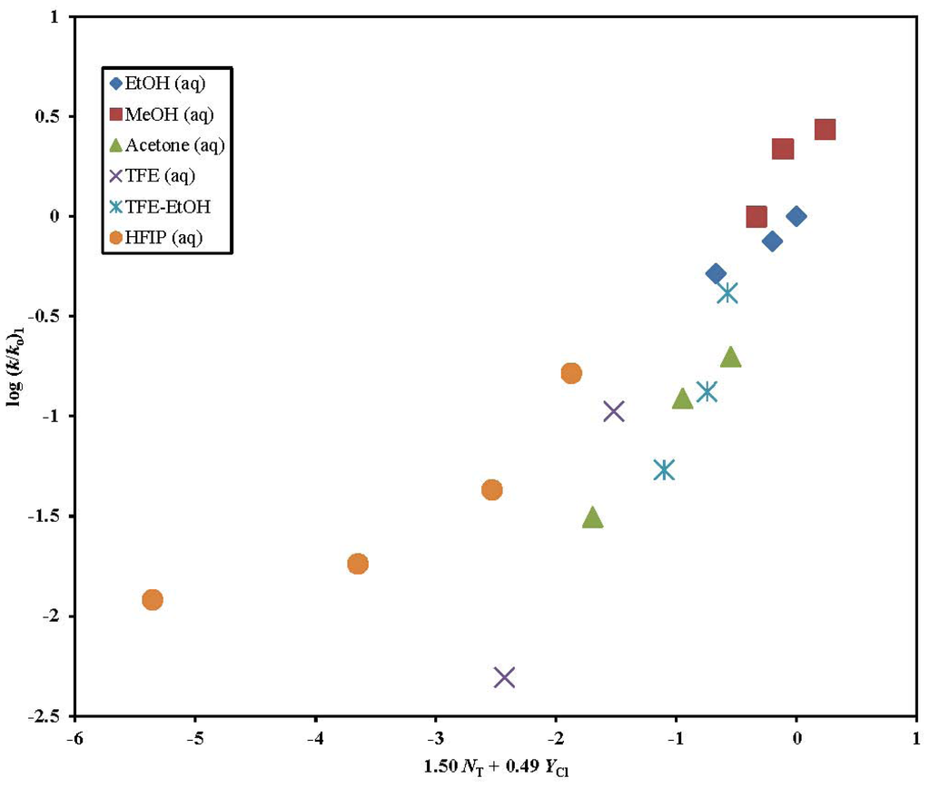 The plot of log (k/ko) for 1 against 1.50 NT + 0.49 YCl.