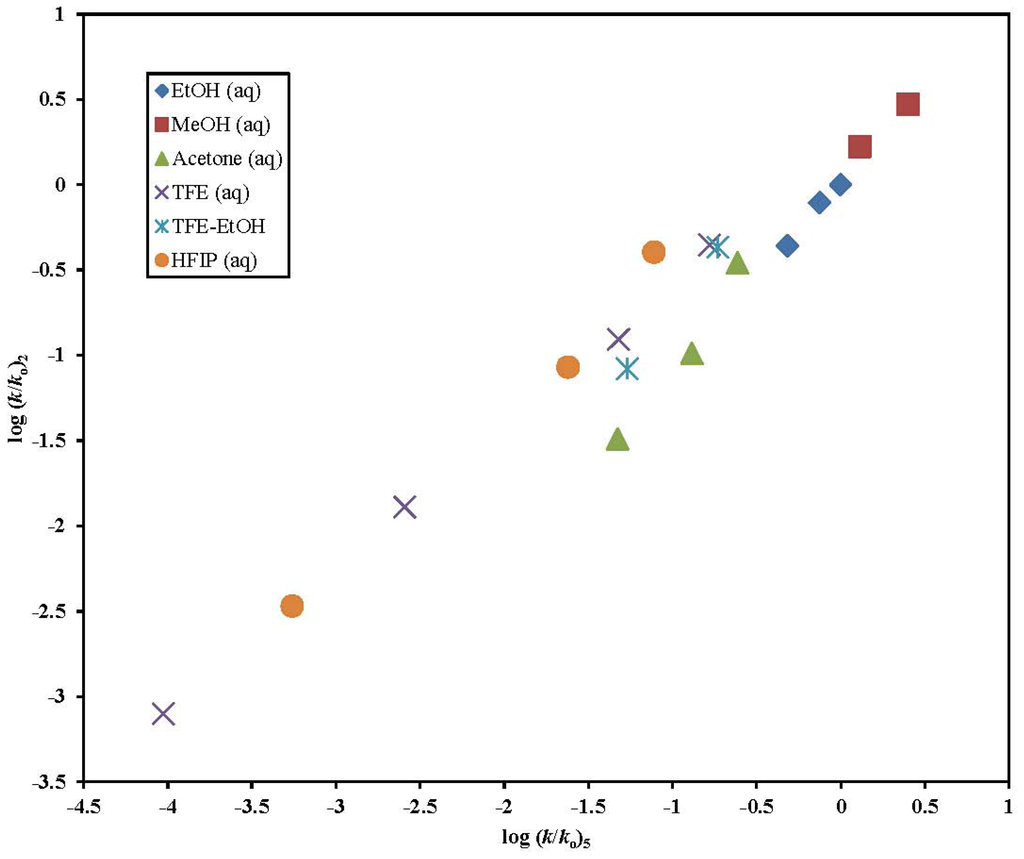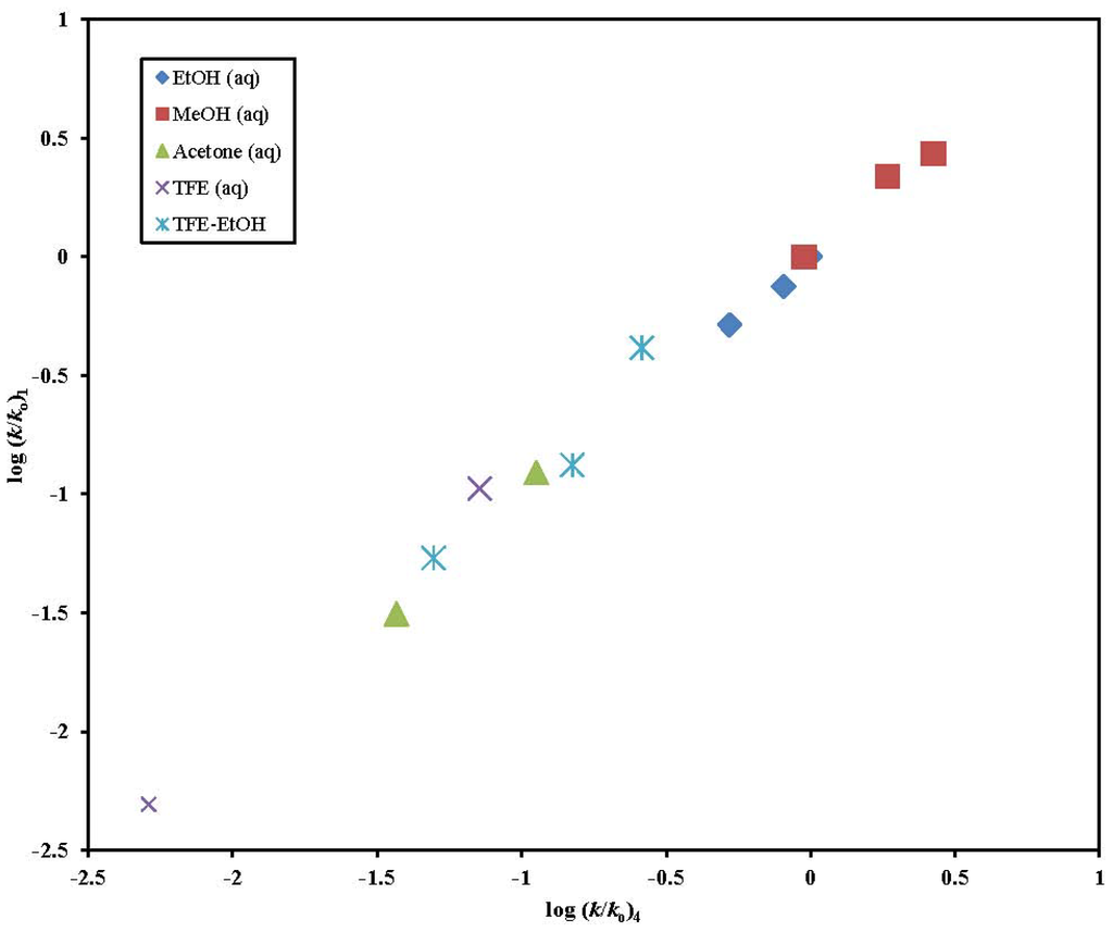 The plot of log (k/ko) 1 against the log (k/ko) values of 4 in the binary aqueous mixtures of EtOH, MeOH, acetone, TFE, and TFE-EtOH.
