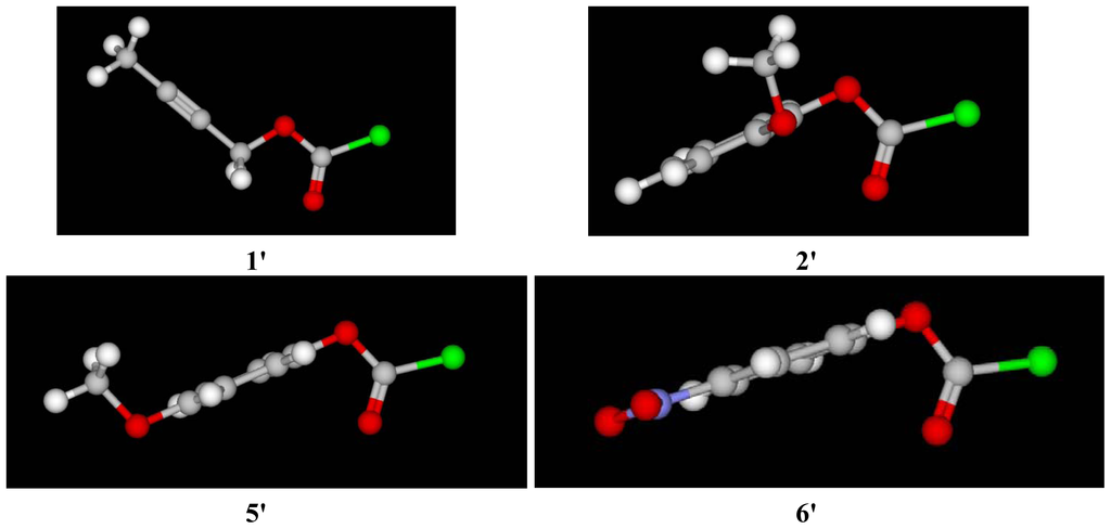 The 3-D images for the syn conformers of 2-butyn-1-yl chloroformate (1′), 2-methoxyphenyl chloroformate (2′), 4-methoxyphenyl chloroformate (5′), and 4-nitrophenyl chloroformate (6′).