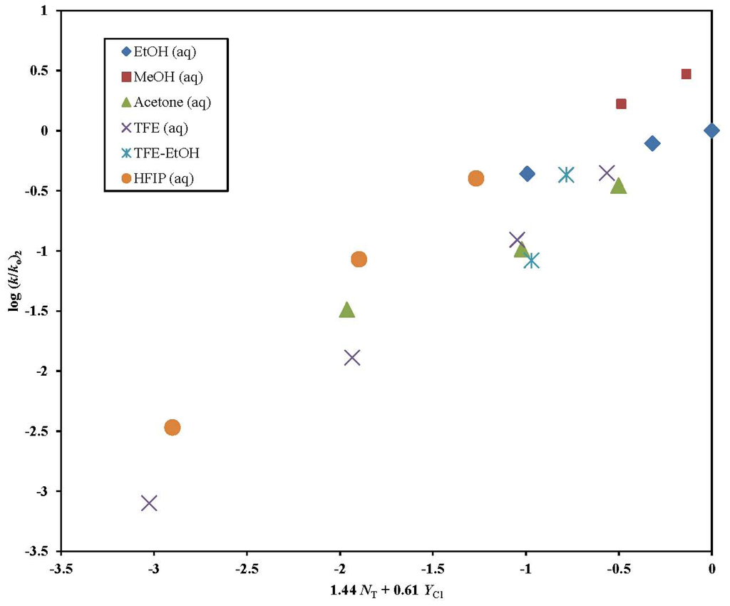 - D’Souza, M.J.; Reed, D.N.; Erdman, K.J.; Kyong, J.B.; Kevill, D.N. Grunwald-Winstein analysis—isopropyl chloroformate solvolysis revisited. Int. J. Mol. Sci 2009, 10, 862–879. [Google Scholar]