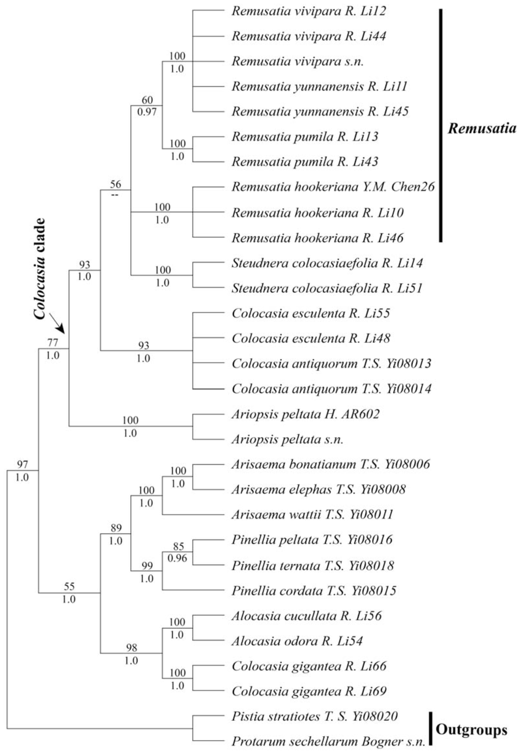 The concatenated plastid data supported the monophyly of the Colocasia clade (PB = 77%, PP = 1.0). Remusatia was part of the Colocasia clade (Figure 1). The monophyly of Remusatia was not supported because R. hookeriana did not form a clade with other three species R. vivipara, R. yunnanensis, and R. pumila (see Figure 1). Excluding Remusatia hookeriana, the remaining Remusatia species formed a supported clade (PB = 60%, PP = 0.97) (Figure 1). Within this clade, Remusatia pumila is sister to the clade containing R. vivipara and R. yunnanensis (Figure 1).