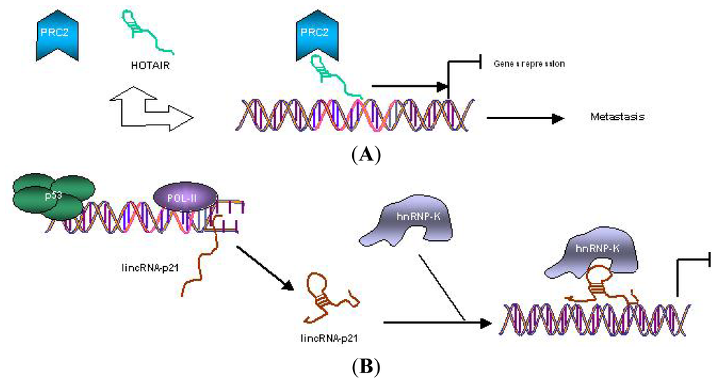 (A) Mechanisms of gene regulation by oncogenic lincRNA HOTAIR. HOTAIR recruits PRC2 to specific gene promoters, inducing gene repression that leads to tumor metastasis; (B) Mechanisms of gene regulation by tumor-suppressor lincRNA-p21, where its expression is directly induced by p53. Then, lincRNA-p21 specifically interacts with hnRNP-K for localization to gene promoters for repression [42].