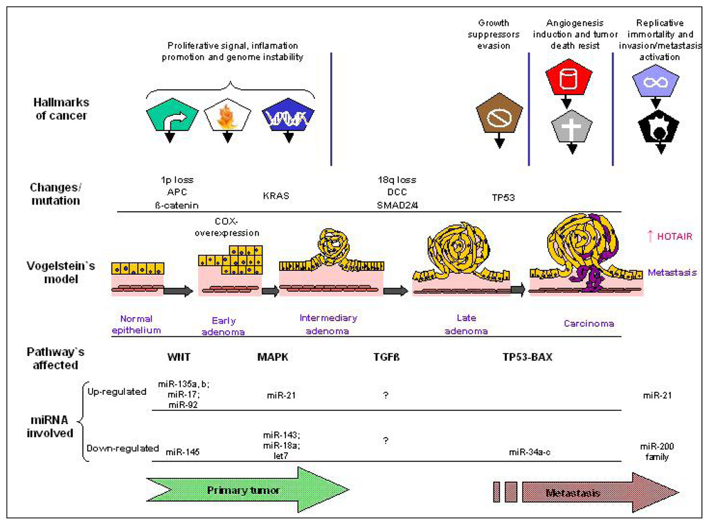 Connection between emerging hallmarks of each acquired capabilities necessary for tumor growth and progression [23] and, Vogelstein’s model of CRC pathogenesis [63]. MicroRNAs’ involved in each way and emerging linc-HOTAIR implication in metastasis features.