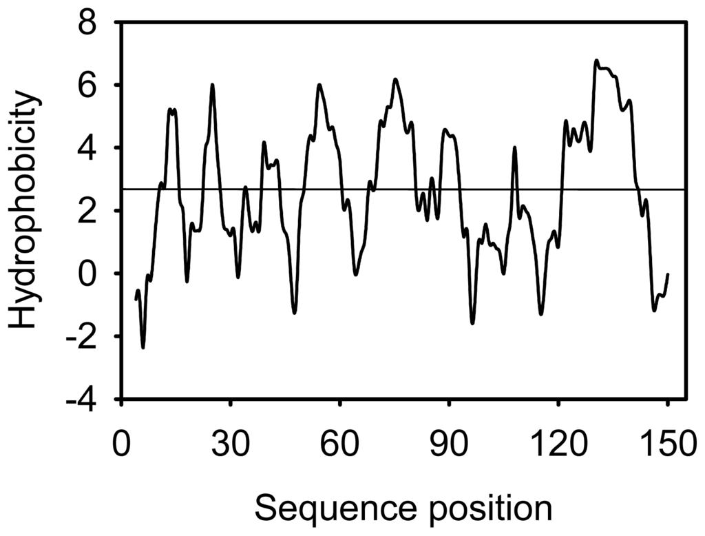 It was predicted also that cSOD1 is highly antigenic as the majority of the protein surface is exposed to the aqueous medium. There are at least six potential antigenic peptides having more than 1.0 antigenic propensity (Figure 10) and seven or more aminoacids in lengths are predicted. The antigenic amino acid sequences and its position are listed (Table 4). The hydrophobic regions of cSOD1 were also predicted (Figure 11). The hydrophobic residues forming the dimer interface are directed under the threshold value and represented by the residues V6, V8, T18, FGDNT (50–54), IGR (113–115) and VIGIAQ (148–153). The electrostatic interacting residues are directed above the threshold line and represented as E132, E133, K136 and T137.