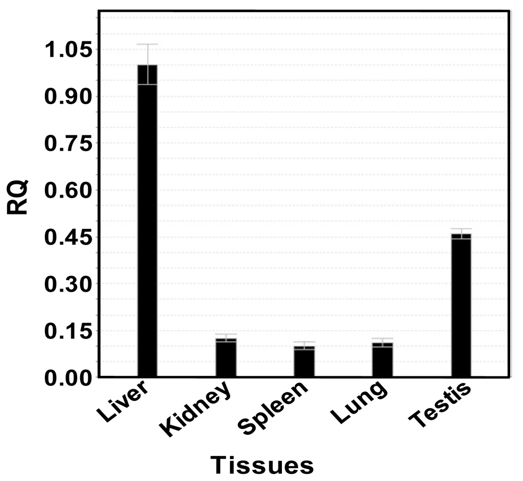 SOD1 is ubiquitously expressed, but is present in some tissues at higher concentrations than others [54]. The level of expression of cSOD1 in different camel tissues (liver, kidney, spleen, lung and testis) is examined using qPCR. The designed primers and the experimental conditions were adjusted to eliminate the primer dimer, self dimer or hairpin form. The expression of cSOD1 in liver (calibrator) and of 18S ribosomal (endogenous control) was used to measure the relative expressions of cSOD1 in kidney, spleen, lung and testis (Figure 12). The highest expression level was found in liver followed by testis, kidney, lung and spleen. Our findings suggest that cSOD1 is highly expressed in liver and testis. The high level in liver is expected where the most of the metabolic processes are performed with the possibility of ROS production. Also it is important to be present in the testis and other tissues of active cell division to avoid any damaging effect caused by superoxide anion.