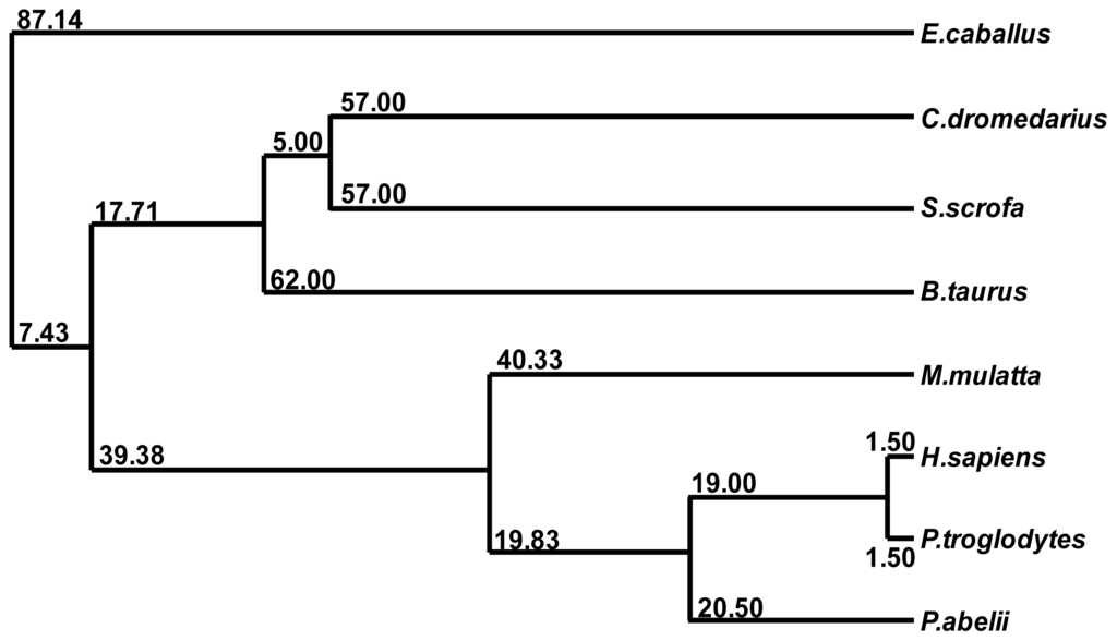The phylogenetic tree of cSOD1 and potentially related genes. The protein sequence of Camel SOD1 was compared with other mammalian sequences of the GenBankTM data base. The alignment was generated with the BLOSUM62 from MAFFT Multiple Sequence Alignment [34,36]