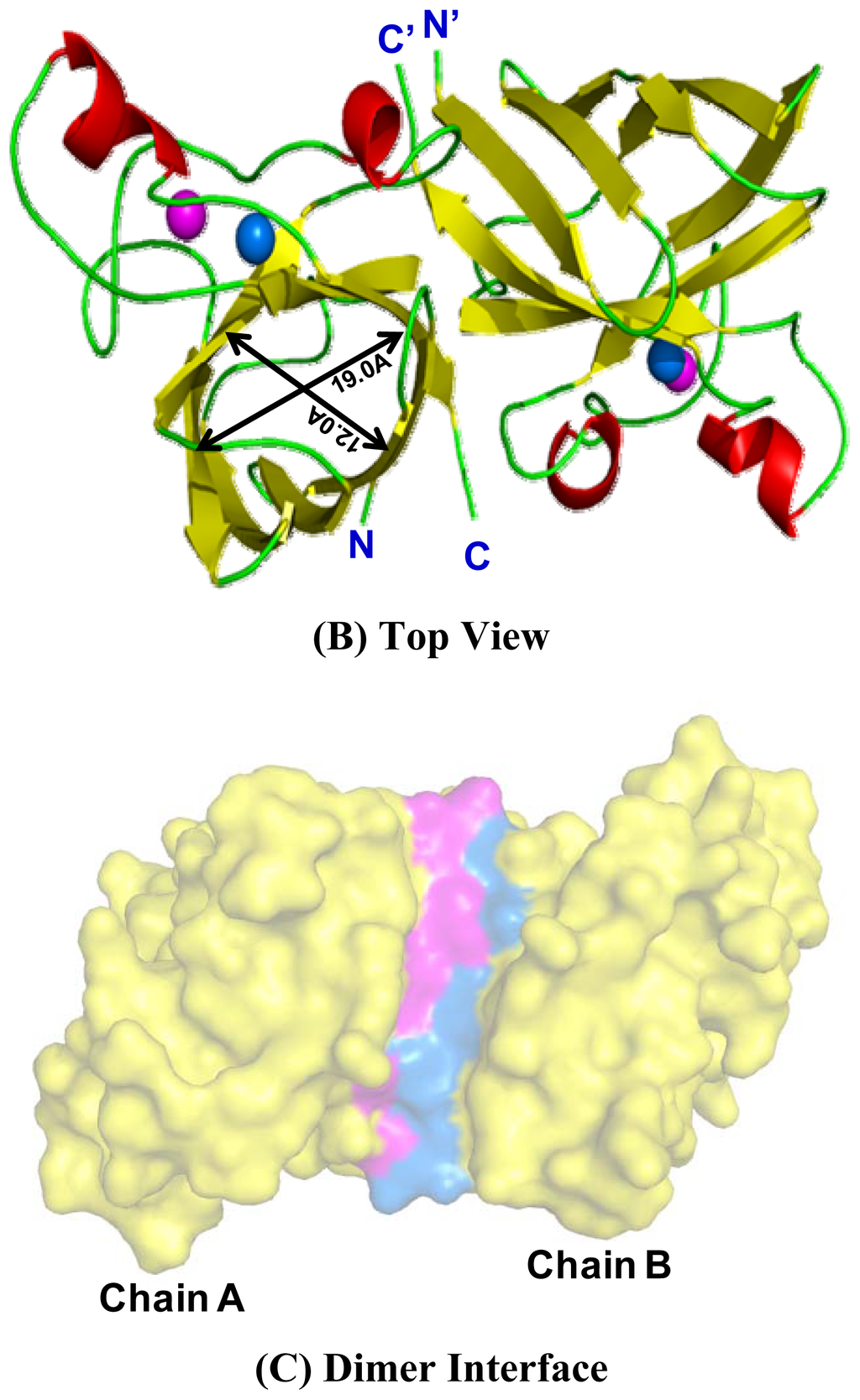 Predicted 3D structure model of cSOD1 and the dimer interface structure. The 3D structure model of cSOD1 was predicted using Swiss-model server [40]. (A) Each dimer contains 8 beta sheets. Active site metal ions are shown as spheres for copper (blue) and zinc (purple); (B) Top view of cSOD1 reveals the β-barrel structure with 19.0 × 12.0 Å pore; (C) Dimer contact forming residues in chain A and B of cSOD1 are shown in magenta and marine colors, respectively.