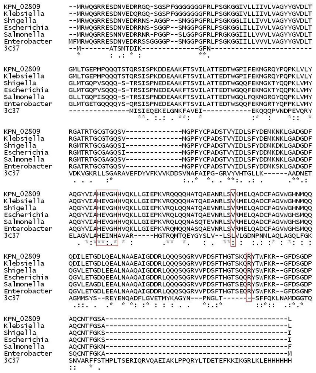Multiple sequence alignment of KPN_02809 with related sequences from bacteria in Enterobactericea family. Conserved motif HEXXH and two important residues (Val-204 and Arg-268 according to KPN_02809 sequence) are highlighted in red.
