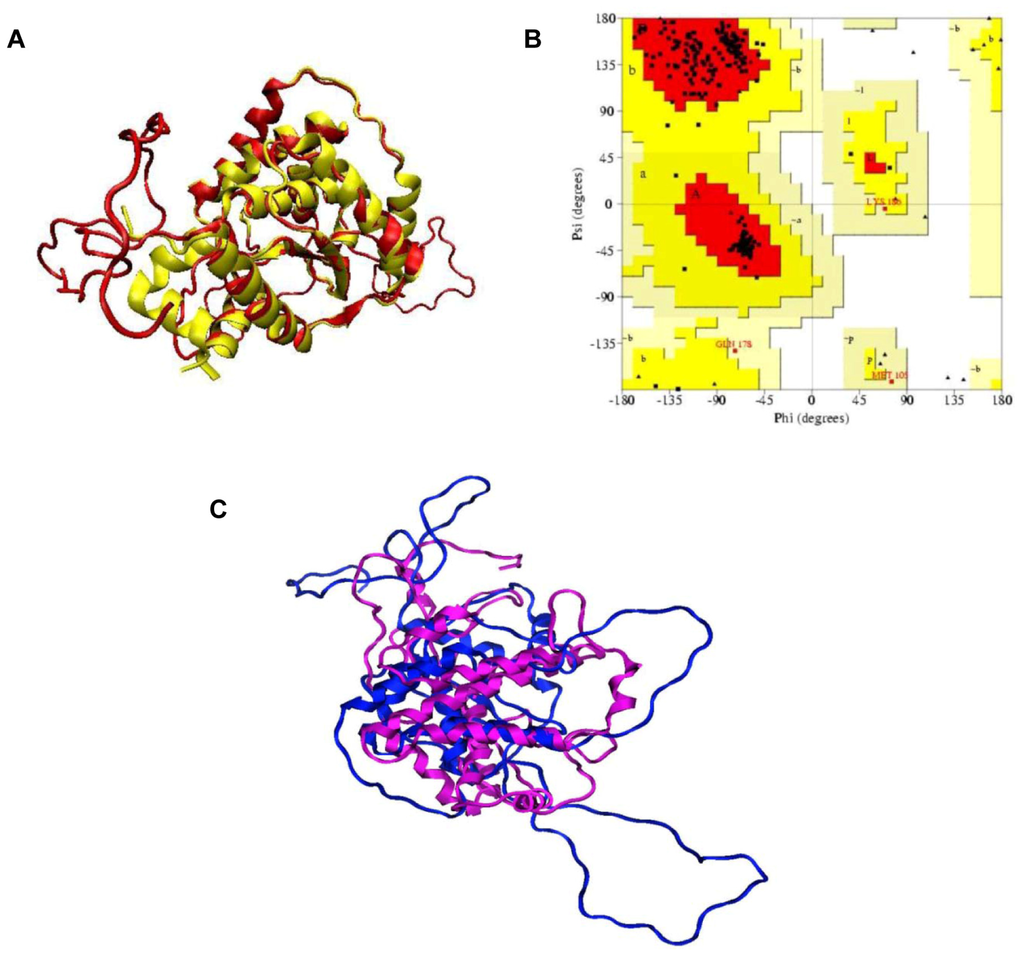 Structural model of KPN_02809. (A) Superposition of the built model of KPN_02809 (red) with template from protein data bank with PDB Code 3C37 (yellow); (B) Ramachandran plot analysis of KPN_02809 model. No residue was found in the disallowed region; (C) Superimposition of models by MODELLER (blue) and I-TASSER (purple) with RMSD of 16.81 Å. Structure built with MODELLER is more extended compared to I-TASSER model. However, the secondary structures in the conserved region for both models are very similar.