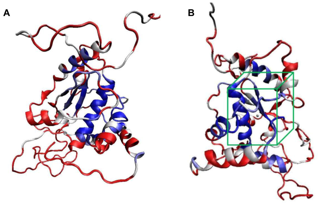 Structural conservation analysis by ProBis. (A) Conservation scoring of the KPN_02809 model by ProBiS. The highly conserved core region is represented in blue and white; (B) KPN_02809 predicted Zn binding site with the grid box (green) is centered on the Zn binding site.