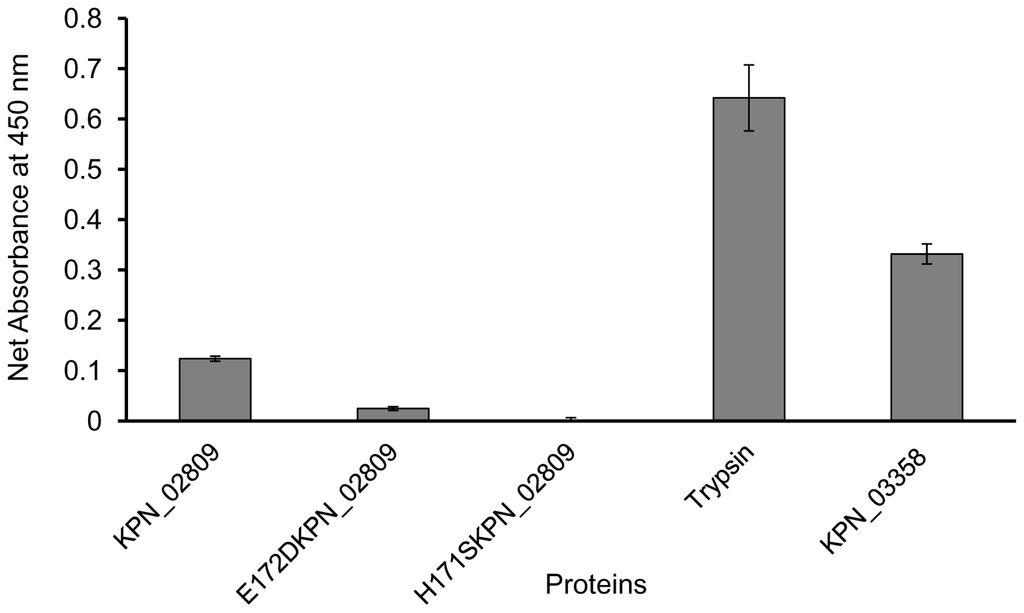 Proteolytic activities of wild-type and mutant KPN_02809. Activity was measured at 30 °C, pH 8 for 60 minutes. The reaction was initiated by adding 20 μg of enzyme protein into a microplate well containing 100 μg of succinylated casein. After incubation, 50 μL of TNBSA solution were added and incubated for an additional 30 minutes. The absorbance at 450 nm was determined and the proteolytic activity was represented by the change in absorbance (ΔA450nm), which was calculated by subtracting the absorbance of the blank. TPCK-Trypsin provided in the QuantiCleave Protease Assay kit and KPN_03358 were included as positive controls and for comparison.