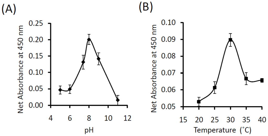 Effect of pH and temperature on the protease activity of KPN_02809. (A) The experiments were performed at 30 °C with succinylated casein as the substrate for 60 min; (B) The experiments were carried out at different temperatures with succinylated casein as the substrate for 60 minutes at pH 8. All values were reported as the means and standard deviations of three independent experiments.