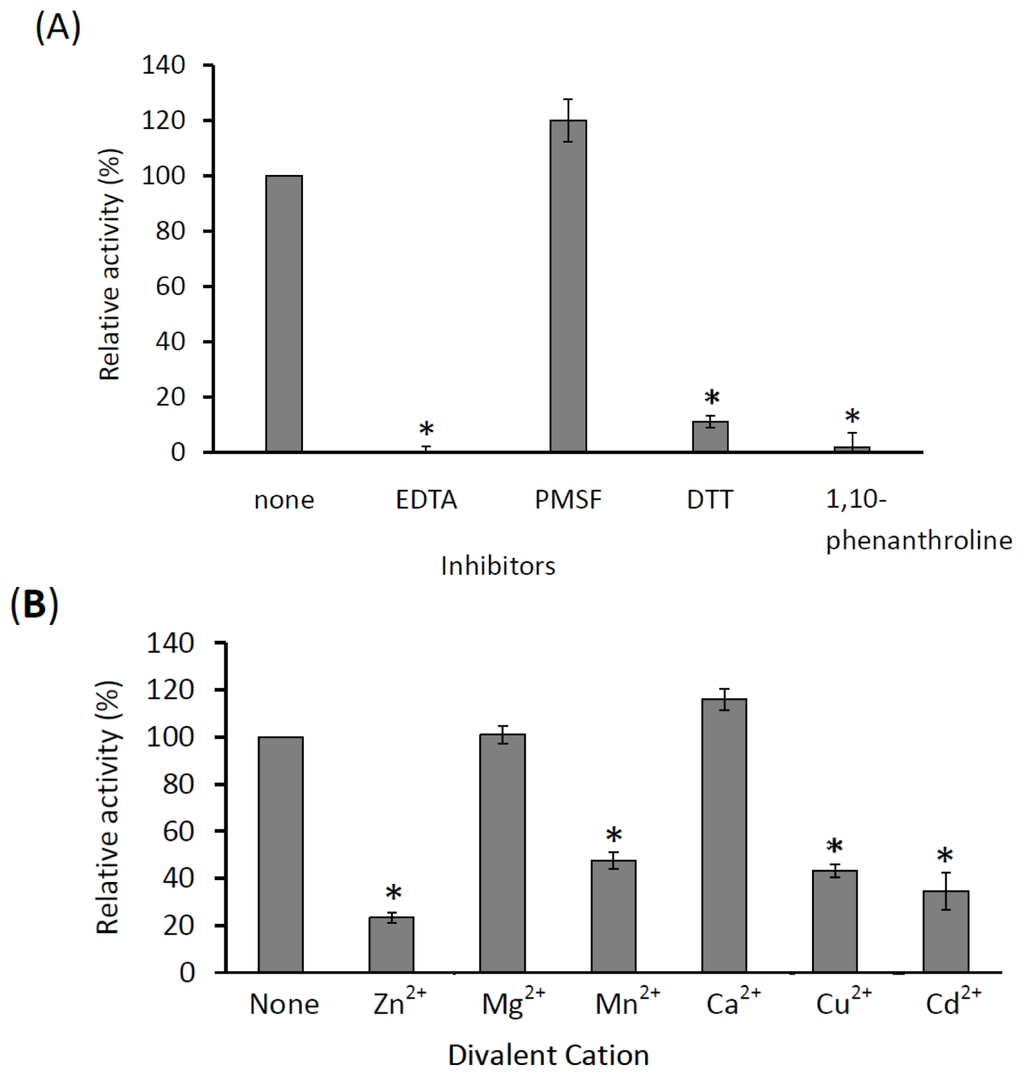 Effect of inhibitors and divalent cations on the activity of KPN_02809 protein. (A) The protein was preincubated with 1 mM of the potential inhibitors for 1 hour at room temperature before the enzyme activity assay at standard conditions was carried out; (B) 1 mM of different cations was added into the assay mixture and activity was determined at 30 °C. The activities of the protein with inhibitors were compared with the control. All the values reported represent the means and standard deviations of three independent measurements. * indicates significant difference at p ≤ 0.05.